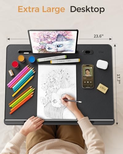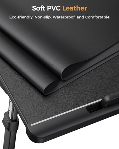 Spacious Leather Desktop:This laptop desk for bed features a spacious top measuring 23.6” x 17.7”, providing ample room for a 17-inch laptop and a dedicated mouse area. The premium leather surface is not only comfortable and non-slip for direct mouse use but also offers an ideal textured feel for drawing and writing.Combining practical function with a sleek, modern design, it delivers both style and everyday comfort.