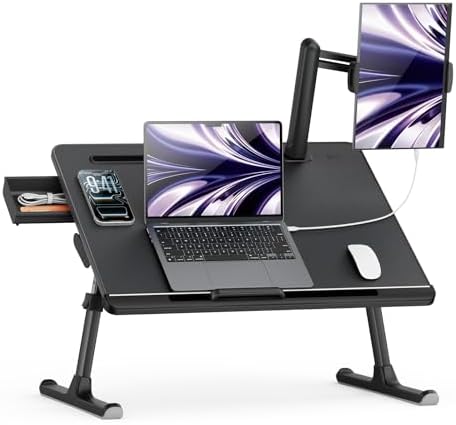 SAIJI Dual Screen Laptop Bed Desk | Foldable Adjustable Lap Desks for Adults, X-Large Couch Bed Tray Table with Portable Monitor Stand and Drawer
