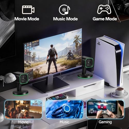 【12 RGB Modes + Dedicated OFF Mode – Full Control】12 dynamic lighting effects: breathing, solid, flowing, and more. Rotate to the OFF mode position – lights turn off completely, speakers stay on. Volume, power, DSP mode, and RGB – all on two front knobs. Long press = power ON/OFF. No app, no learning curve.