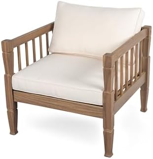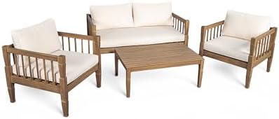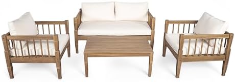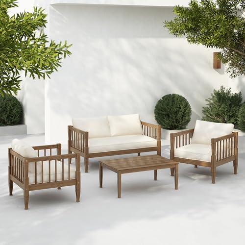 This 4 piece outdoor seating set features a rustic slat design crafted from premium acacia wood, adding a timeless, natural aesthetic to your outdoor space. The set includes a loveseat, two club chairs and a coffee table, all designed for durability and comfort. The water-resistant cushions are thick, plush and easy to clean, ensuring a comfortable and low-maintenance experience. Built to withstand the elements, the acacia wood frame is sturdy and resistant to wear, offering long-lasting beauty and reliability for your patio, deck or balcony. Perfect for outdoor relaxation and gatherings.