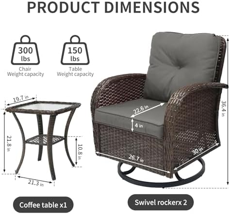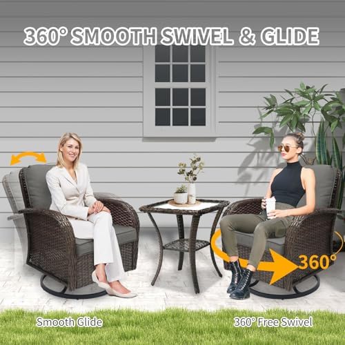 【Smooth 360° Swivel & Gentle Gliding Motion】The furniture set feature a smooth 360-degree swivel and a gentle gliding/rocking motion. The sturdy, anti-slip round base ensures stability during movement, allowing you to easily follow the sun, join conversations, or find your perfect relaxing rhythm.