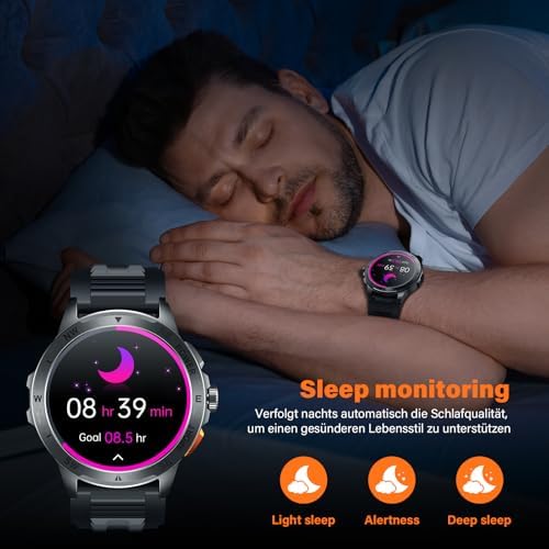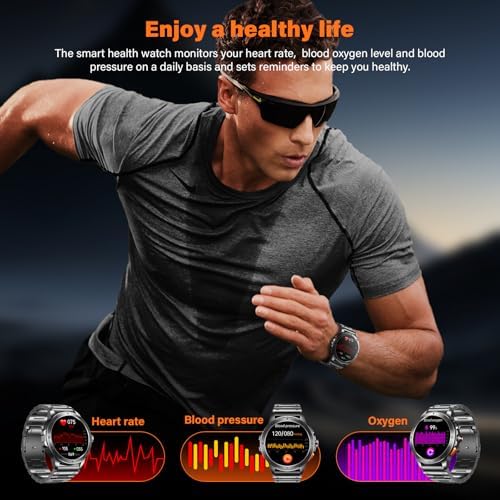 Military smart watch 1.43″ AMOLED display: Bluetooth calling function & notifications, With a high-fidelity speaker and integrated microphone, you can answer calls directly via the men’s fitness watch. Sync SMS, WhatsApp, Facebook, and other apps – never miss any important information.