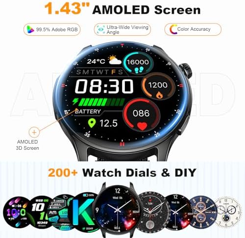1.43″ AMOLED touchscreen for clear visuals: The ios android smart watch is equipped with a AMOLED color screen, delivering superior image quality and touch sensitivity. Step counter watch has over 200 unique online dials available, you can also customize the watch face using any photo—such as pictures of family, pets, and more—to create a truly unique look.Calorie counter watch come with 2 watch straps of different colors.