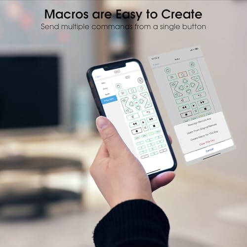 Programming Macros Feature: Customize a single button to perform multiple actions, such as turning on the TV, receiver, and switching receiver inputs, or turning everything off simultaneously. Program up to 10 commands to a single button, combining actions from various devices. Effortlessly customize key actions, rearrange buttons, and record macros for maximum flexibility. Save time and effort with this powerful feature.