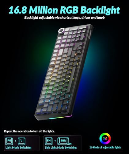 96% Layout & Multifunctional Knob:This wireless mechanical keyboard adopts a 96% layout, integrating most functional keys of a traditional full-size keyboard while incorporating an innovative knob design for efficient operation. Its compact size saves desk space and is ideal for efficient office work and immersive gaming experiences. Users can easily adjust volume, switch media playback, and regulate light brightness via the knob, making operations more convenient
