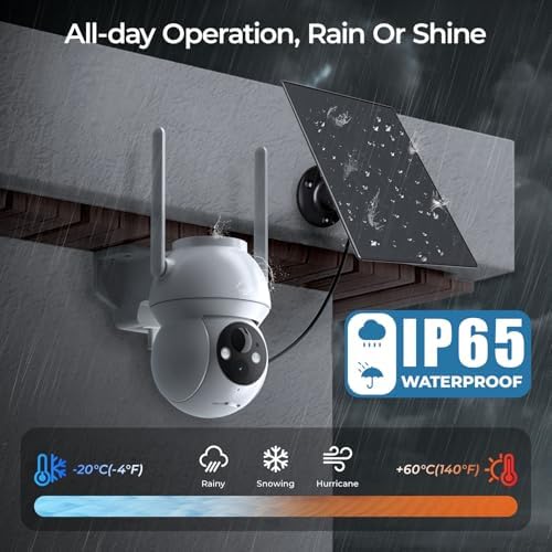 【Solar-Powered, 100 % Wireless Operation】 As a solar camera outdoor wireless, the unit pairs a detachable high-efficiency panel with a long-life rechargeable battery for perpetual daylight operation. An upgraded 2.4 GHz antenna (5 GHz not supported) ensures rock-solid Wi-Fi across large yards, eliminating every cable for true plug-and-play placement.