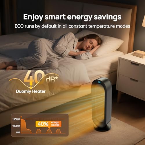 【Instant Heating】DUOMIY space heater with 1500W and Quick 2s PTC Ceramic Heating with wide-angle 100° oscillation to sweep around your whole living space. Electric heater swiftly distributes warm air to offices, bedrooms, or living rooms. Heating Coverage: 250 sq.ft