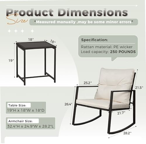 【Spacious Chairs Design】Our outdoor 3-piece rocking bistro sets are quite roomy, and provide enough room to seat comfortably, and the legs that are connected and arm resets are designed to provide additional support and balance as you shake the chair.
