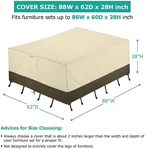 【Cover Size】88”W x 62”D x 28”H, fits patio sectional conversation set, rectangular/oval dining table and chairs set etc. Note: To make sure the cover fits your furniture set properly, please push chairs under the table to measure the overall dimension. Please put support pole underneath to raise the middle of the cover to prevent water from collecting on top.