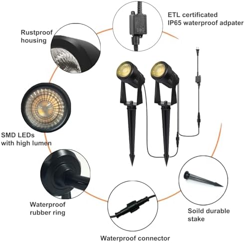 【Easy to Install, Plug and Play】Wired landscape lighting kits are includes 4 spot lights, 1 transformer and cables for fast and easy set up to brighten your yard. Just stick into the ground or use the included screws to mount on the wall, simple to install, hassle-free to use