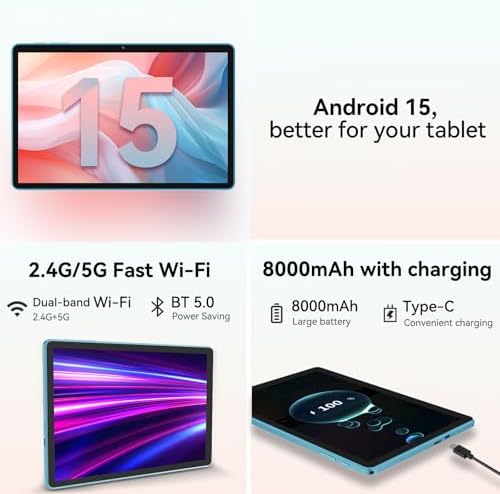 High-Performance Octa-Core Android 15 Tablet: tablet is powered by a high-performance Unisoc T615 octa-core CPU, with a maximum frequency of 2.0GHz. Experience seamless multitasking and smooth operation, enhanced battery life, and reduced power consumption. Additionally, it features the latest Android 15 OS, enhancing your privacy and security with options for personalized configurations