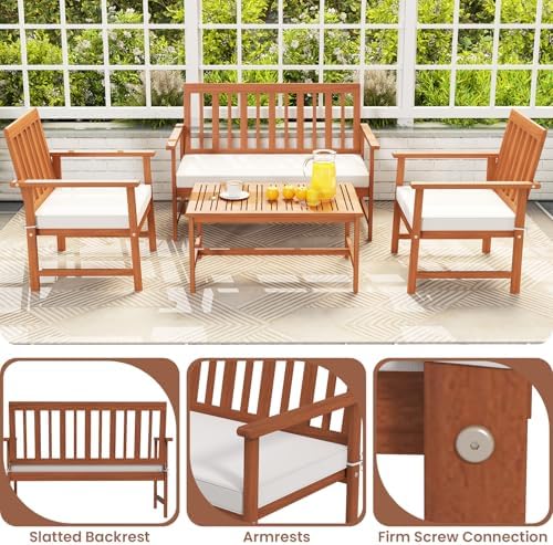 Elevate your outdoor space with this 4-piece acacia wood patio conversation set. Crafted from solid acacia wood, this outdoor furniture set is designed to withstand the elements, ensuring lasting beauty. The set includes 2 armchairs, a loveseat, and a matching coffee table, perfect for relaxing or entertaining. The wide seats, supportive backrests, and armrests ensure hours of relaxation, while the soft cushions add extra comfort. With its sturdy wood construction and stylish design, this tale and chairs set is perfect for entertaining guests or enjoying peaceful moments outdoors. Its versatile, flexible layout allows you to arrange it to fit your deck, backyard, or balcony. Whether you’re chatting or unwinding, this versatile sofa set brings charm and functionality to any outdoor setting.
