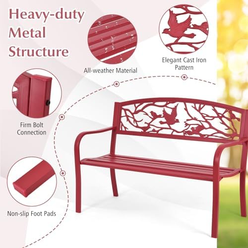 Exquisite Beauty, Timeless Charm: Infuse your outdoor space with elegance using this metal bench adorned with whimsical twig and bird patterns on its backrest. Not just a seating option but a stunning decorative piece enhancing your garden or patio.