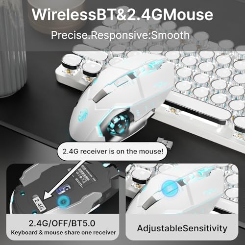 104-key Anti-ghosting & 19 Lighting Effects: The clicky keyboard cute wireless adopts 104-key anti-ghosting technology, and allows multiple keys to be pressed at the same time without conflict. The office is more efficient and games are smoother. The retro typewriter keyboard and mouse can adjust 19 lighting effects, including 14 basic effects and 5 game lighting effects. Also, this cute keyboard USB adopts an ergonomic design and is also an excellent typing tool for office work