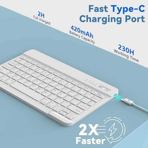 【Long Life Battery & Magnetic Detachable Keyboard Case】Built-in premium Li-ion battery with energy-saving mode, 2-3 hours full charge, works for at least 80 hours, stand by for 130 days. A spring mechanism underneath each key ensures a tactile response with every stroke, helping you to type faster and with less error than on a touchscreen. Please charge it when the keyboard power indicator flashes red