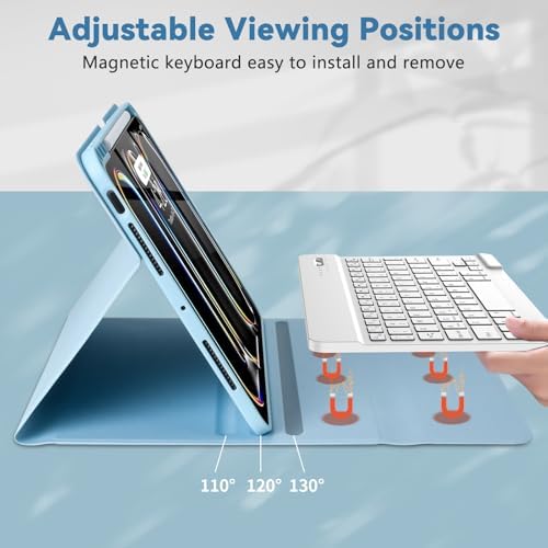 【Multiple Viewing Angle and Pen Holder】Keyboard Case for iPad Pro 11-inch (M4) is magnetically attached and very versatile and the thoughtful design easily adjusts to whatever comfortable angle suits you best. That makes the iPad work like a laptop, so it’s Perfect for working, writing, taking notes, typing, and editing or watching videos. Let you be efficient and do other stuff that needs to get done quickly. It has a pen slot inside to prevent the apple pen from being lost