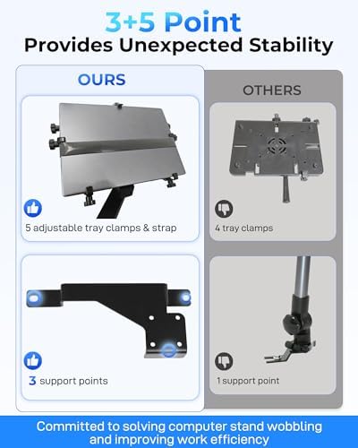 Unique Design of 3+5 Fixation : Our mounting base adopts 3 support points for supporting and 5 adjustable tray clamps, strap to fix the computer, which reduces the risk of computer sliding and wobble of computer mounts in bad road conditions