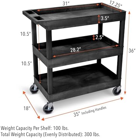 Supports Up to 300 lbs. for Heavy-Duty Tasks – With a 300 lbs. total weight capacity (100 lbs. per shelf), this rolling cart with wheels is perfect for transporting tools, equipment, and oversized items, making it an ideal garage storage or warehouse solution.