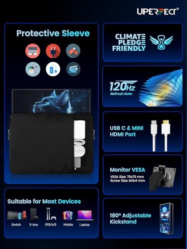 120 HZ & FREESYNC: UPERFECT portable monitor 18.5 inches owns 120 Hz high refresh rate and FreeSync, which made fluent gaming experience; A fast speed of 120 Hz allows you to see the next frame quickly and makes image to appear smoothly; Gamers can response rapidly to opponents and aim at target easily using this large portable monitor 120 Hz; FreeSync technology can also virtually eliminates screen tearing and stuttering