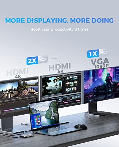 【Ultra-portable & Compact Powerful Workstation】 You could easily put the docking station in your bag or pocket. Designed from rolled aluminum to be durable yet lightweight, lighten your load and ditch the extra cable adapters, and consolidate all features with this Plug and Play laptop docking station. Including 2x 4K HDMI, VGA, USB-C charging, Gigabit Ethernet, SD/TF card slot,2x USB 3. 0 Ports and 2x USB 2. 0 Ports.
