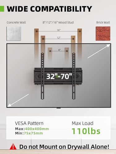 Universal Design: This TV Wall Mount fits for most 32-69inch TVs with VESA mounting hole patterns 75x75mm – 400x400mm. Please verify the VESA pattern of TV before purchase