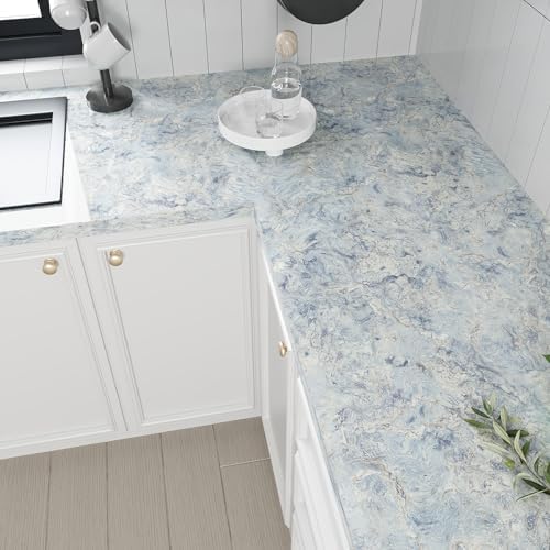 𝐏𝐫𝐨𝐝𝐮𝐜𝐭 𝐃𝐞𝐭𝐚𝐢𝐥𝐬: Marble contact paper, made of high quality vinyl, thick, durable, air bubble free. 15.7 inches wide by 118 inches long, covers 13 Sq. Ft., cream blue marble design, glossy finish