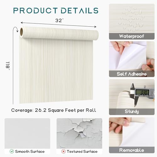 𝐏𝐫𝐨𝐝𝐮𝐜𝐭 𝐃𝐞𝐭𝐚𝐢𝐥𝐬: Wood contact paper, vintage cream white wood wallpaper, smooth finish, NON-TEXTURED, made of high quality vinyl, thick, durable, 32 inch wide x 118 inch long covers 26 sq ft, ideal for large surface or kitchen island, countertops
