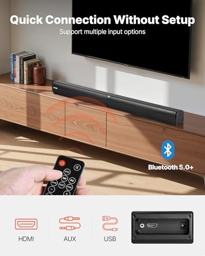 Multiple Inputs: The soundbar for TV supports Bluetooth 5.0 wireless connection and wired options, including HDMI, AUX, and USB. You can easily connect your TV, phone, or computer. Enjoy seamless audio without complicated adjustments