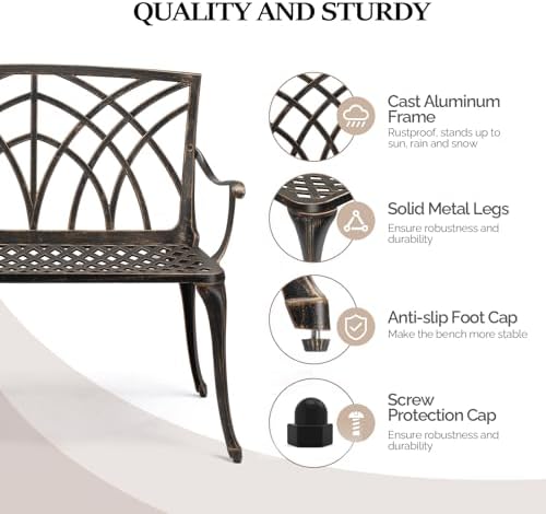 QUALITY AND STURDY – Aluminum tube make the bench seat panel and armrest, backrest. The surface painted weather resistant chair allow it to withstand sunshine , rain and snow. Anti-slip feet caps make the bench more sturdy and protect the floor