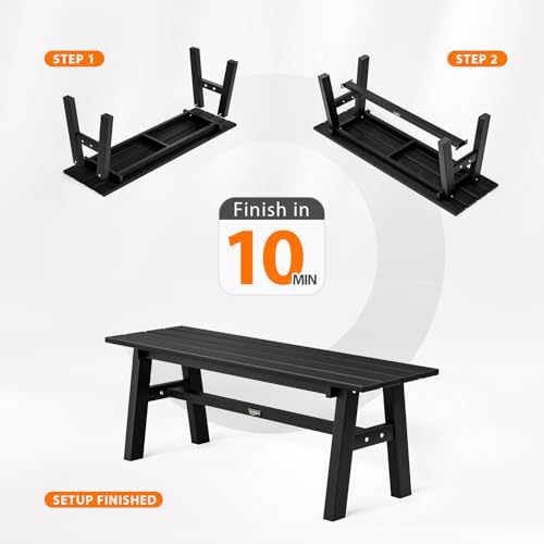 All Weather Material: Constructed with all-weather HDPE material, this black outdoor bench can endure various weather conditions, from sunlight and snow to strong winds. Unlike wood, it’s resistant to fading, denting, cracking, peeling, and rotting. Its steel legs provide additional stability