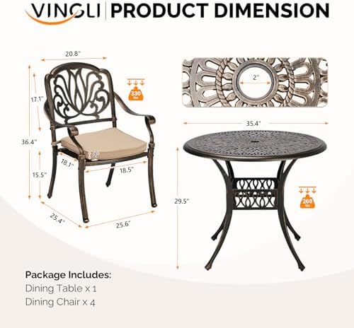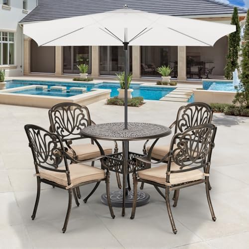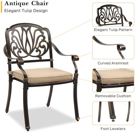Cast Aluminum Patio Dining Sets: The cast aluminum frames resist rust, fading, and extreme weather, ensuring long-lasting durability for outdoor use