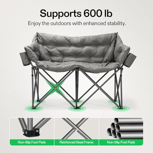 Heavy Duty & Durable: Built with a robust powder-coated steel frame, this double camping chair ensures stability, and supports up to 600 lb; Its 600D Oxford fabric is soft, breathable, water-repellent, and tear-resistant, making it perfect for outdoor use