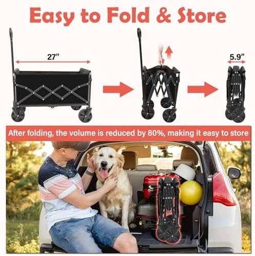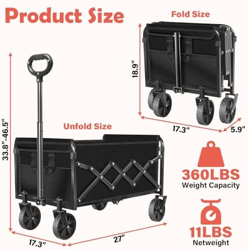 Ultra-Lightweight & Compact: Foldable wagon weighs just 11 Lbs. Wagon cart one-second folding design shrinks to a compact size, fitting easily in car trunks, closets, or tight storage spaces. No assembly needed—ready to use folding wagon in seconds. Size of wagon cart with wheels foldable is 46.5″x27″x17.3″, and turn to 17.3″x5.9″x18.9″ when folding the collapsible wagon with wheels