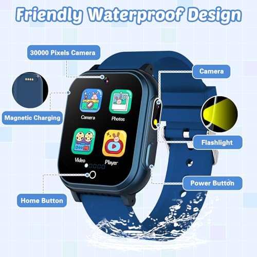 👍Dual Camera & Video: Kids smart watch has built-in HD dual camera makes it more convenient for kids to record every happy moment in their lives. Children can use magic cameras take some hilarious photos with family or friends, Set your favorite photo as clock face. Kids watch is capable of store 15000+ HD photos