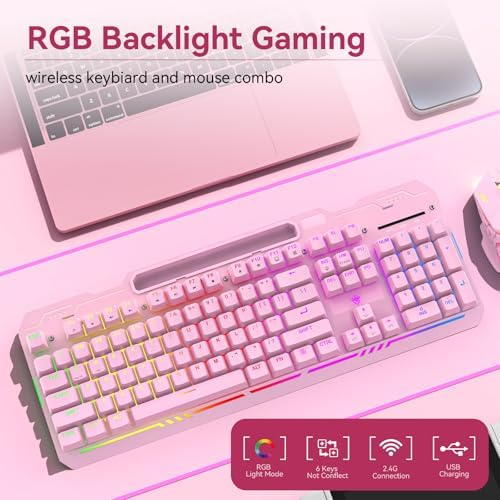 The keyboard has built-in three groups of rainbow backlight effects, supports 2 breathing modes, 3 static modes, and 4 brightness levels. The luminous design of Letters, logo, gaps and surroundings makes it the best light up wireless keyboard on the market (Note: There is no surrounding light in the right top corner due to the indicator light). The mouse has a built-in 7-color cyclic gradual lighting effect.