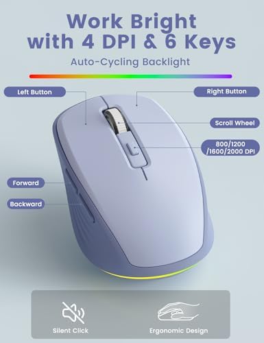 WIRELESS BACKLIT MOUSE: This mouse offers 4 DPI levels (800/1200/1600/2000) for smooth and precise control. The soft backlight adds style without distraction, while silent clicks reduce noise for a more focused workspace.