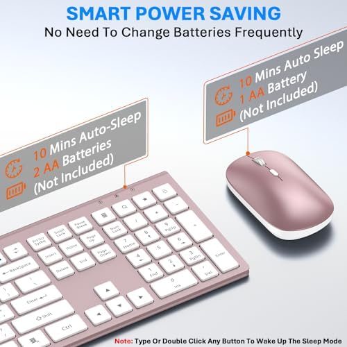 ENERGY SAVING & DURABILITY : The wireless mouse and keyboard features with smart sleep mode for saving power. Idle for 10 mins, the keyboard and mouse will sleep mode, press any button or key to wake up. You can go for months without the hassle of changing the batteries. The keyboard needs 2 x AA batteries, the mouse needs 1 x AA battery. (Battery Not Included)