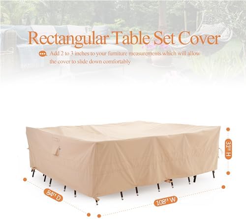 ✓Total Protection: Featuring ripstop PU coated fabric, the cover is designed to protect dining table & chairs and furniture set from sun, rain, snow, dirt, animal hair, bird poop etc. Fits up to 108W x84D x 31H inches