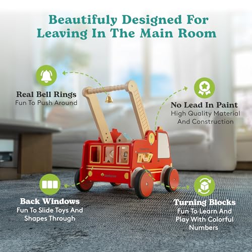 Smart Storage Solution: Benefit from the spacious storage container, allowing your child to carry their favorite toys and treasures as they explore the world around them with the Timberoo Rescue Steps Fire Truck Push Walker.