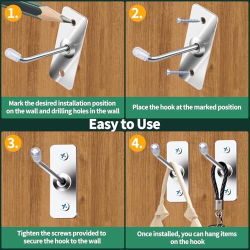 【Designed For Self-Installation】 Easy to install by oneself. Sept 1: Mark the desired installation position on the wall and drilling holes in the wall; Step 2: Place the hook at the marked position; Step 3: Tighten the screws provided to secure the hook to the wall; Step 4: Once installed, you can hang items on the hook.