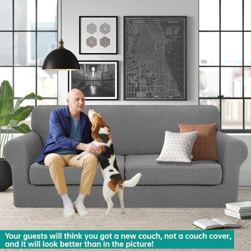 NEW & IMPROVED FABRIC: Our unique wider and thicker jacquard checks (0.6 by 0.6 inch) design sofa covers look more fashionable and elegant than some other couch covers with small checks on Amazon, makes your sofa look different! The 280GSM high gram thickened fabric is adopted to improve the pet couch cover more durable, skin-friendly, no pilling, no fading, soft and comfortable, it is very breathable in summer, also suitable for all year round use