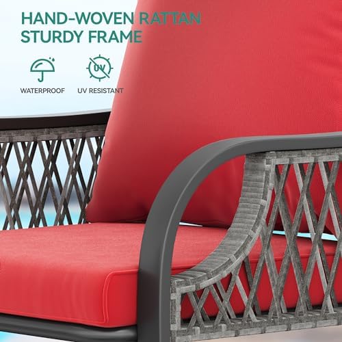 Great Outdoor Bistro Set: Our 3-piece bistro set includes two C Spring Motion Chairs and a side table with a brown glass top; The large seats and thick cushions ensure comfort, while the rattan armrests add a touch of elegance; This set is good choice for your patio, porch, poolside, garden, or balcony