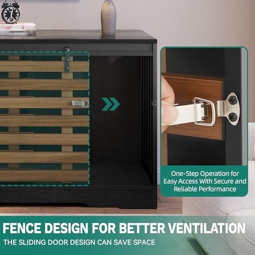 Sliding Fence-Style Doors: Our indoor dog crate features sliding doors with a stylish fence-style design and a secure lockable latch, offering easy access to your dogs while ensuring their safety and providing a well-ventilated, comfortable space