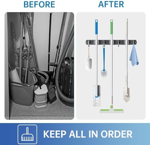 🏡【ORGANIZING & SAVING SPACE】Our mop and broom holder wall mount can keep messes organized in just 3 minutes. You can easily mount your broom, mops, rakes, brushes and any other tools, saving space for your kitchen, garage, garden, laundry, closets, bathroom, office, commercial, etc..