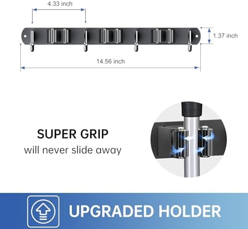 🏡【NON-SLIDE DESIGN】Each rack of the broom and mop holder wall mounted features an adjustable triangular design. The spring-loaded, double rubber gripped slots can keep a stronger hold on your items with diameter of 0.7 inch-1.3 inch. Whether wet mops or baseball bats, nothing slips.